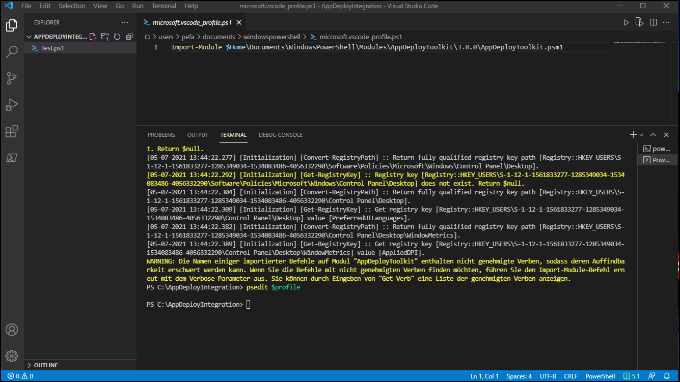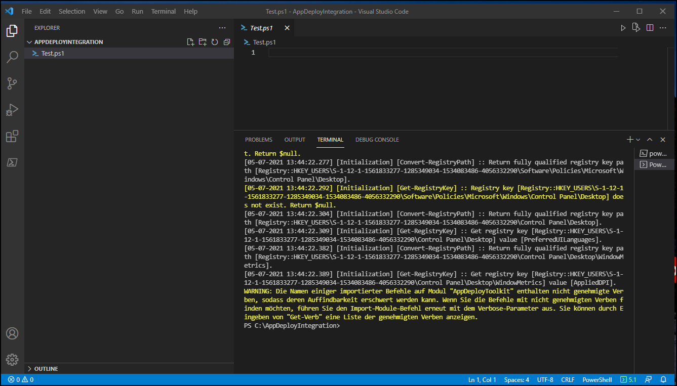 Durch den Clear-Host-Befehl wird im Terminal Fenster die Modulinformationen gelöscht. Nun können wir durch die Eingabe eines PowerShell-Befehls aus dem PSADT die korrekte Integration testen.