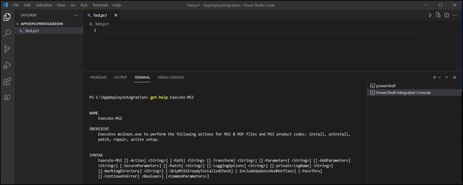 Erscheint, wie im Screenshot unten, die Beschreibung und der Syntax des Befehles, hat die Integration des PSADT in der integrierten PowerShell-Konsole von VS Code funktioniert.