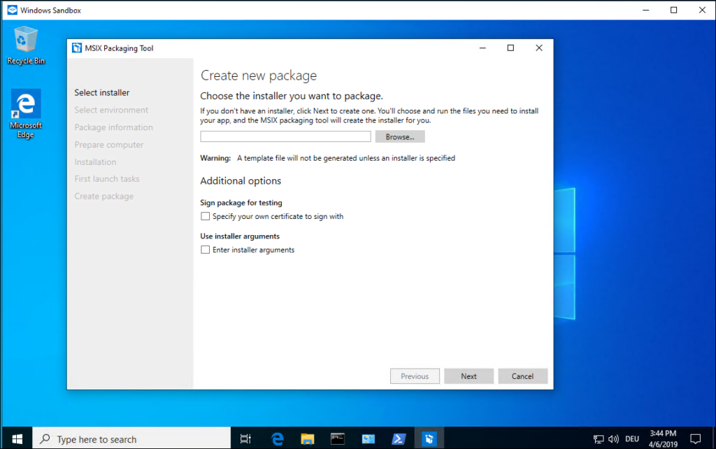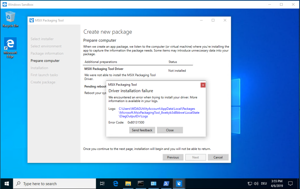 Wie ich ehrlich gesagt bereits vermutet hatte, funktioniert das MSIX Packaging Tool in der Sandbox leider nicht. Damit kommen wir heute schon nach kurzer Zeit zu einem Ergebnis – wenn auch nicht zu einem besonders erfreulichen.