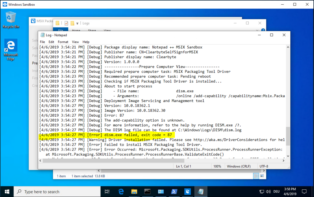 Wir bekommen also eine Fehlermeldung, Bummer. Dem Log entnehmen wir, dass DISM.exe in der Sandbox für das MSIX Packaging Tool nicht funktioniert: